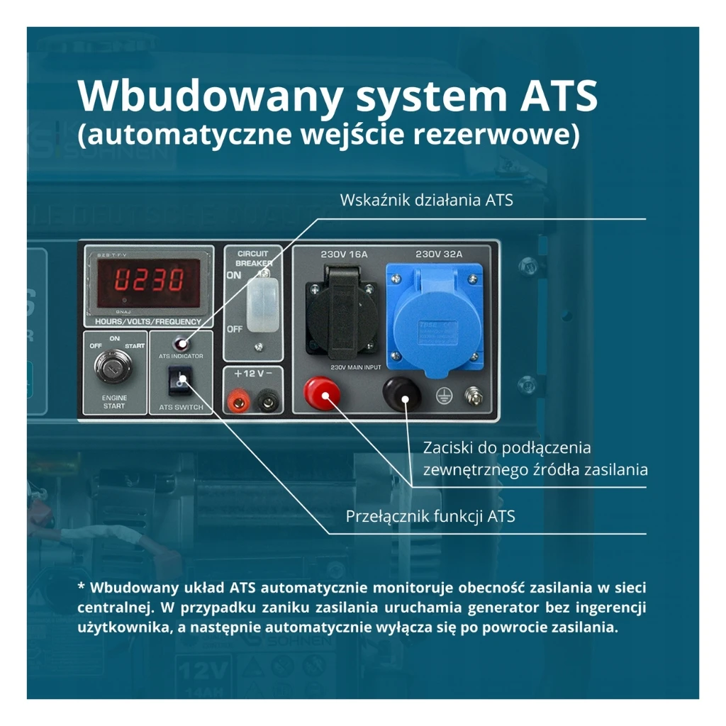 Jedną z cech generatora KS 10000E ATS z rozruchem elektrycznym jest automatyczny system ATS (automatyczne załączanie rezerwy). Funkcja ta pozwala na podłączenie agregatu prądotwórczego do instalacji domowej w przypadku przerwy w dostawie prądu z sieci system automatycznie uruchamia generator, po powrocie zasilania sieciowego wyłącza generator i przełącza na zasilanie sieciowe. Funkcja staje się niezbędna i bardzo wygodna w użytkowaniu w obiektach ze stałą temperaturą oraz w przypadku korzystania przez osoby starsze lub schorowane, a także pod nieobecność użytkowników.