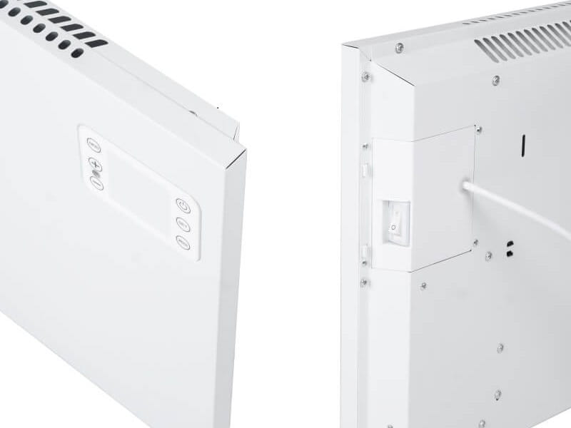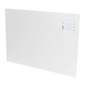 Grzejnik elektryczny płytowy o mocy grzewczej 800 W montowany do ściany z elektronicznym panelem sterowania i pilotem zdalnego sterowania.