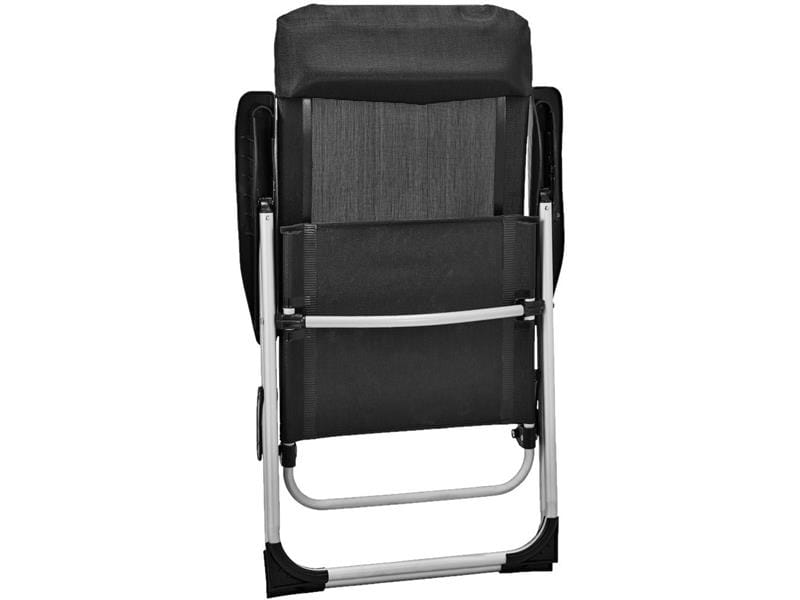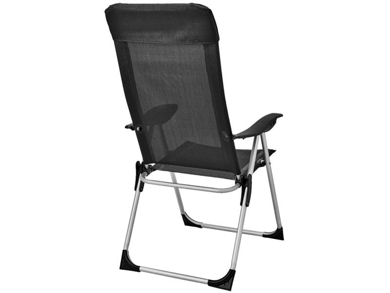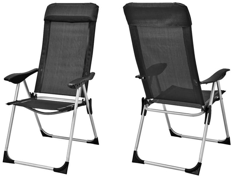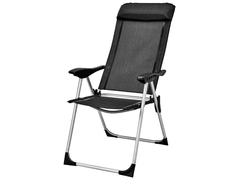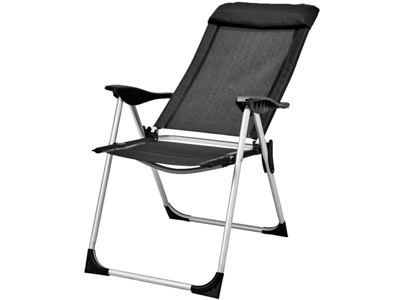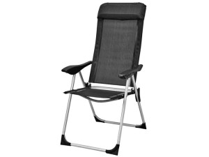 Wygodne krzesło campingowe z wyściełanym zagłówkiem oraz regulacją oparcia na pięciu poziomach.