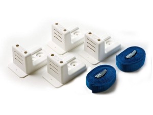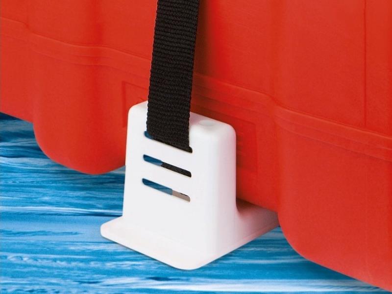 Mocowanie zbiornika paliwa z taśmą firmy CAN-SB, w skład zestawu wchodzą: cztery (4) podstawki plastikowe białe oraz dwa (2) pasy spinające.