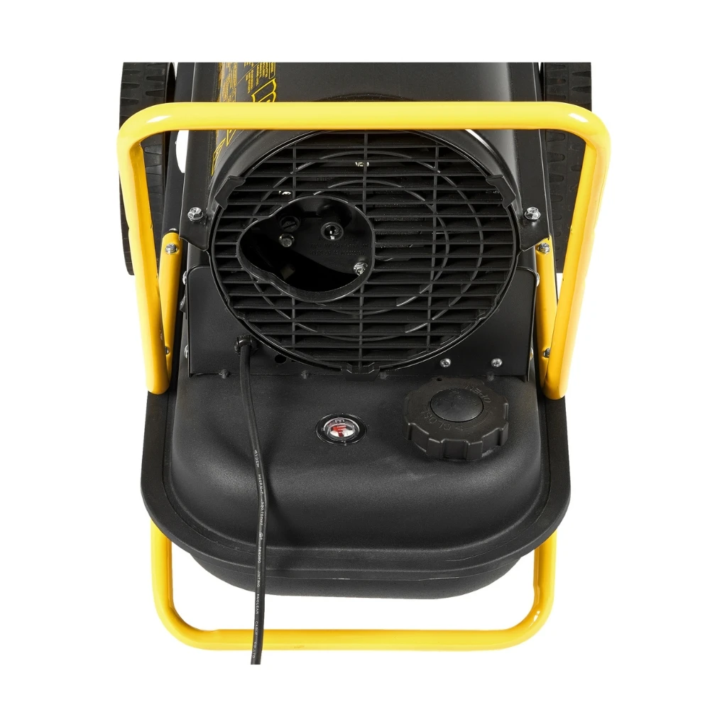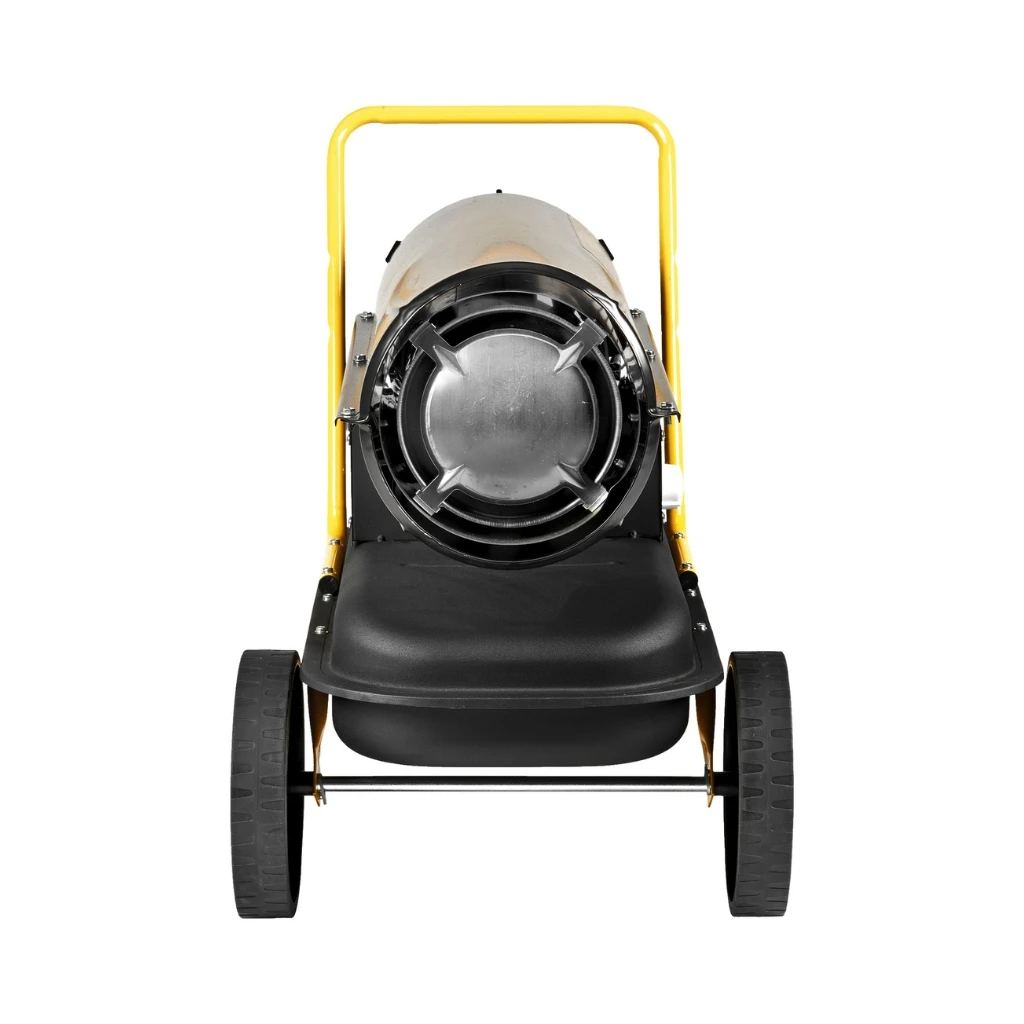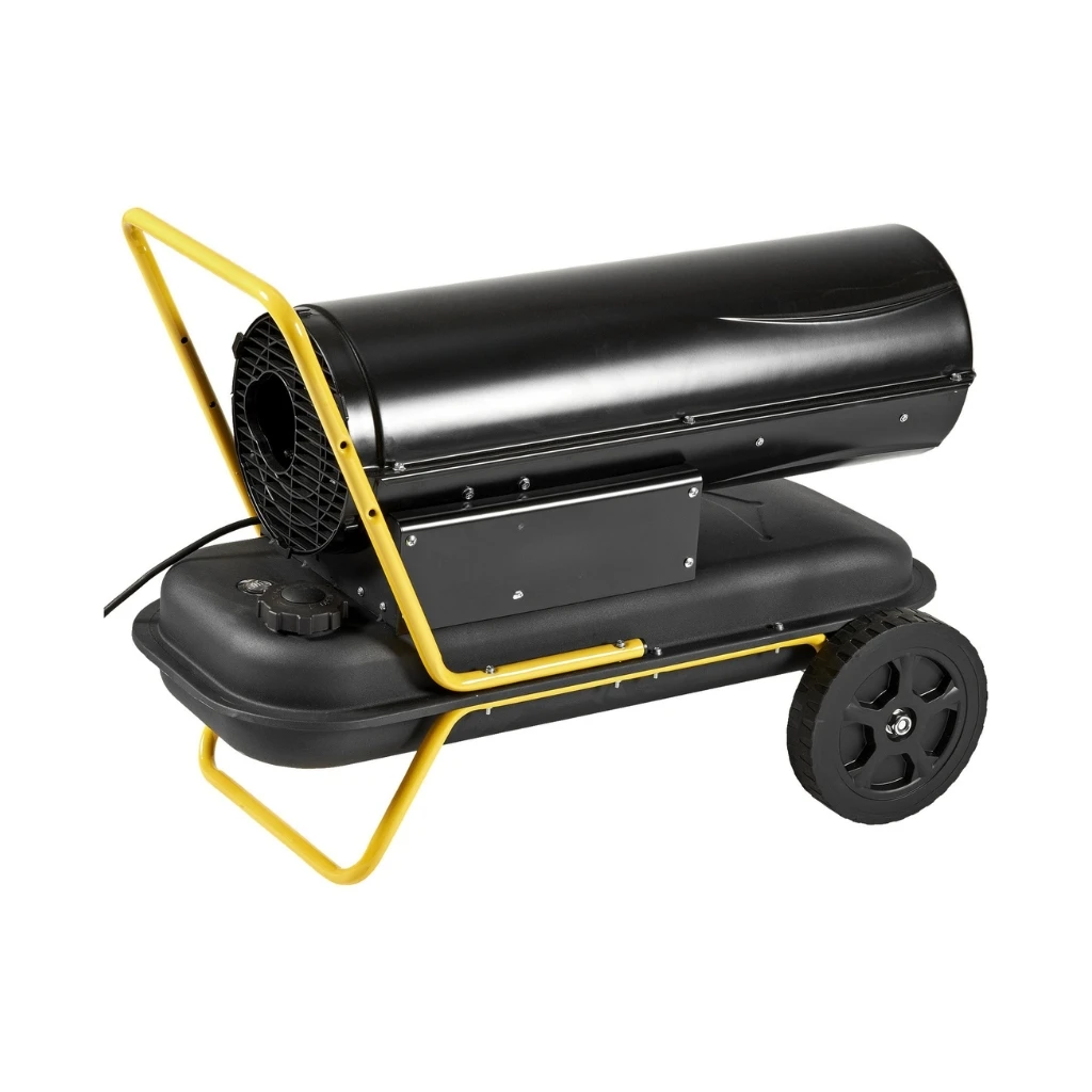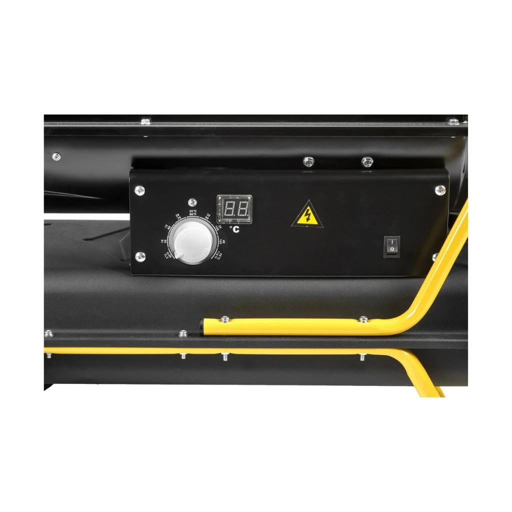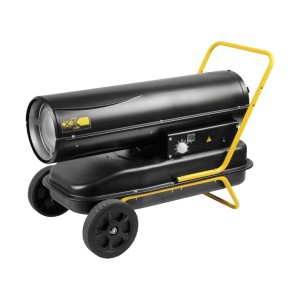 Mobilna nagrzewnica olejowa o mocy grzewczej 20 kW z otwartą komorą spalania i elektronicznym regulatorem temperatury.