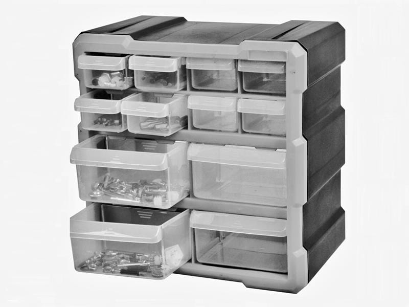 Szuflady z przezroczystego tworzywa znakomicie nadają się do posortowania drobnych artykułów, takich jak śrubki, gwoździe, nakrętki i igły.