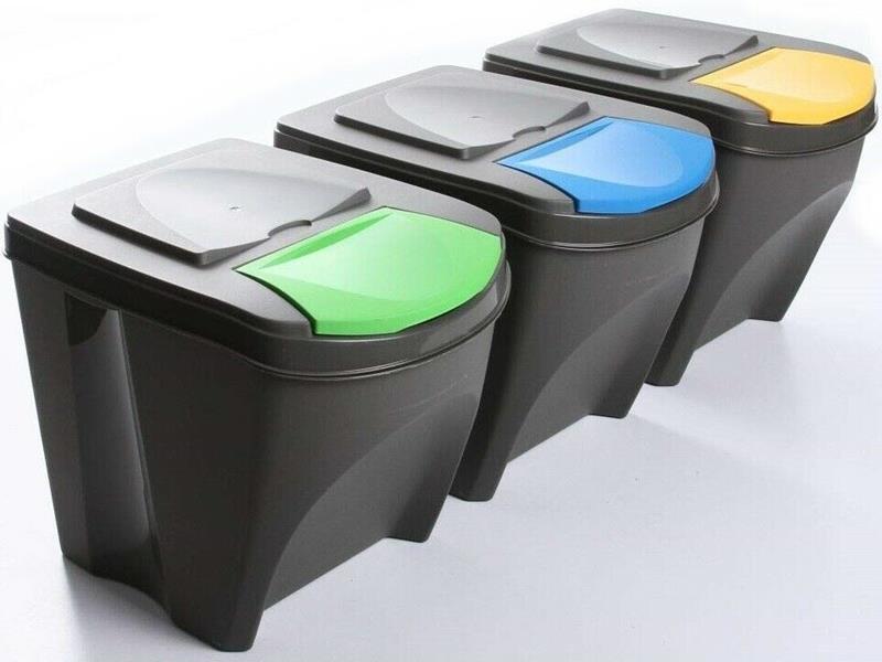 Zestaw 3 pojemników do segregacji śmieci.
